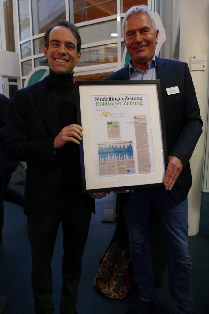 Dr. Vöhringer bescheinigte dem Verein, dass der Begriff „Nachbarn in Not“ eine hervorragende Gründungsidee war, dass man sich um seinen Nachbarn kümmert. Er dankte für das großartige Engagement. Salvatore Romeo, der in Sindelfingen aufgewachsen ist, will sich trotz häufiger Auslandsreisen lokal engagieren und mit neuen Projekten im Internet NiN auch für Jüngere attraktiv machen. Die Frage an Betina Hartig, ob im Ablauf der Anträge etwas zu verbessern sei, antwortete sie, dass es gut laufe: „Es ist für uns viel wert, dass Sie uns vertrauen und ohne Hürden das Geld überweisen und die Menschen glücklich machen.“ Die anderen Gesprächspartner versicherten, dass sie am Ball bleiben, um das gesellschaftliche Leben in der Stadt zu stärken.